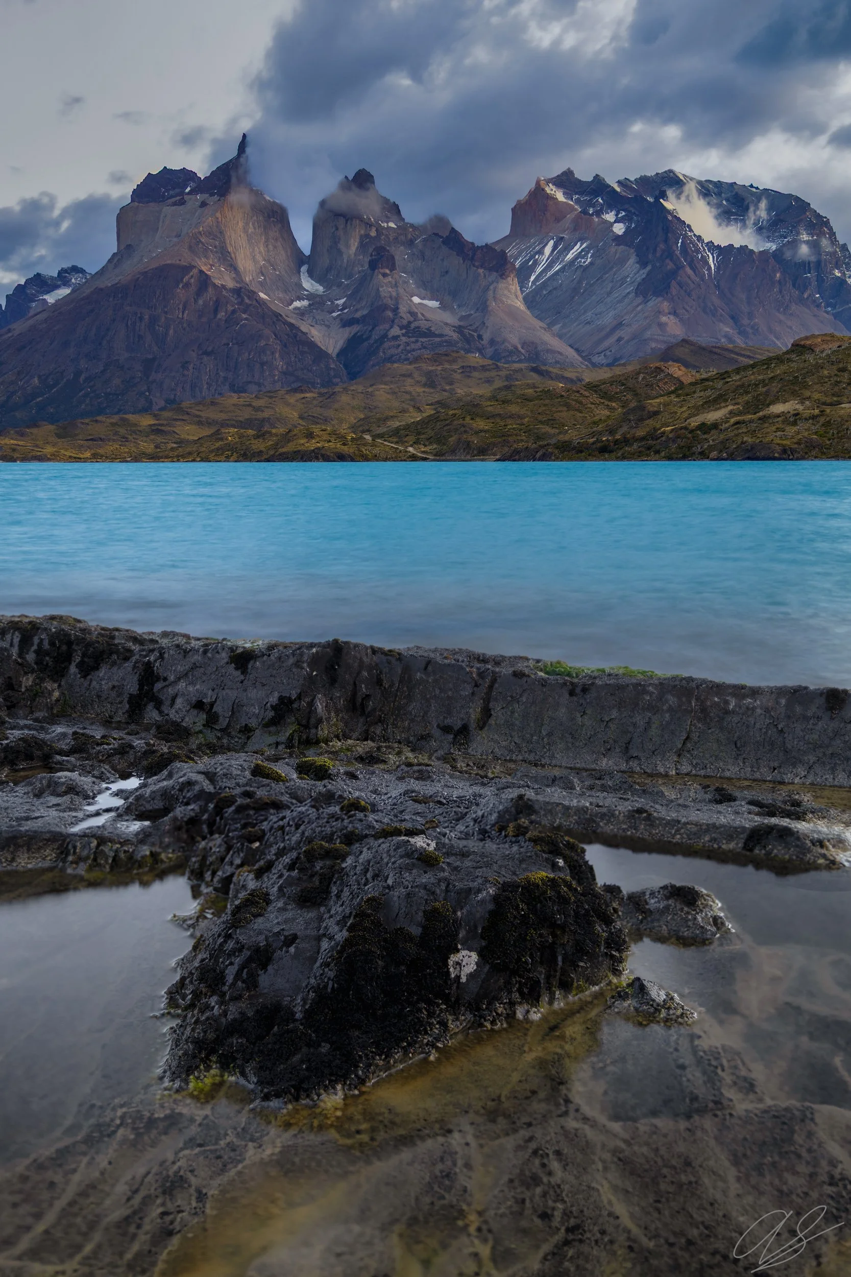 I captured this image on a moody Patagonia morning in Torres del Paine National Park in Chile. While I was hoping for a sunrise, the clouds in Patagonia are always dramatic. With the cloudy weather, the turquoise waters of Lago Pehoe were especially vibrant. I also loved the foreground element in this scene. The rock, surrounded by a small pool of water (gathered from the waves of the lake), felt like an anchor to the mountains beyond.