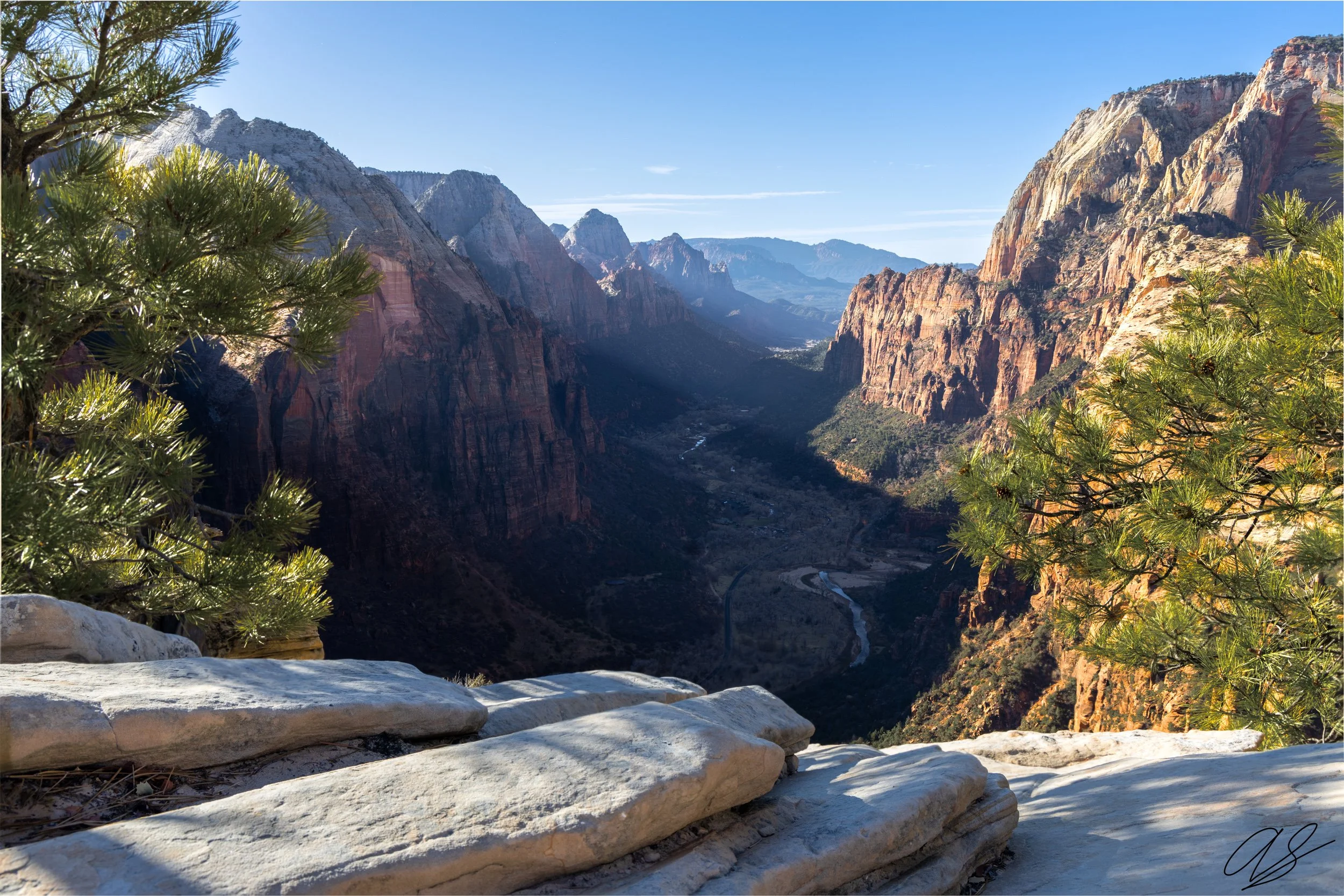While harrowing to reach, the top of Angel’s Landing provides 360 degree views of Zion Canyon below. From the top, you can see the Narrows, Great White Throne, Zion Lodge, Lady Mountain, the Watchman, etc. This perspective looks down canyon. The white rock slabs point the viewer’s eye towards the canyon below, the mountains, and beyond. This is your reward for reaching the top!