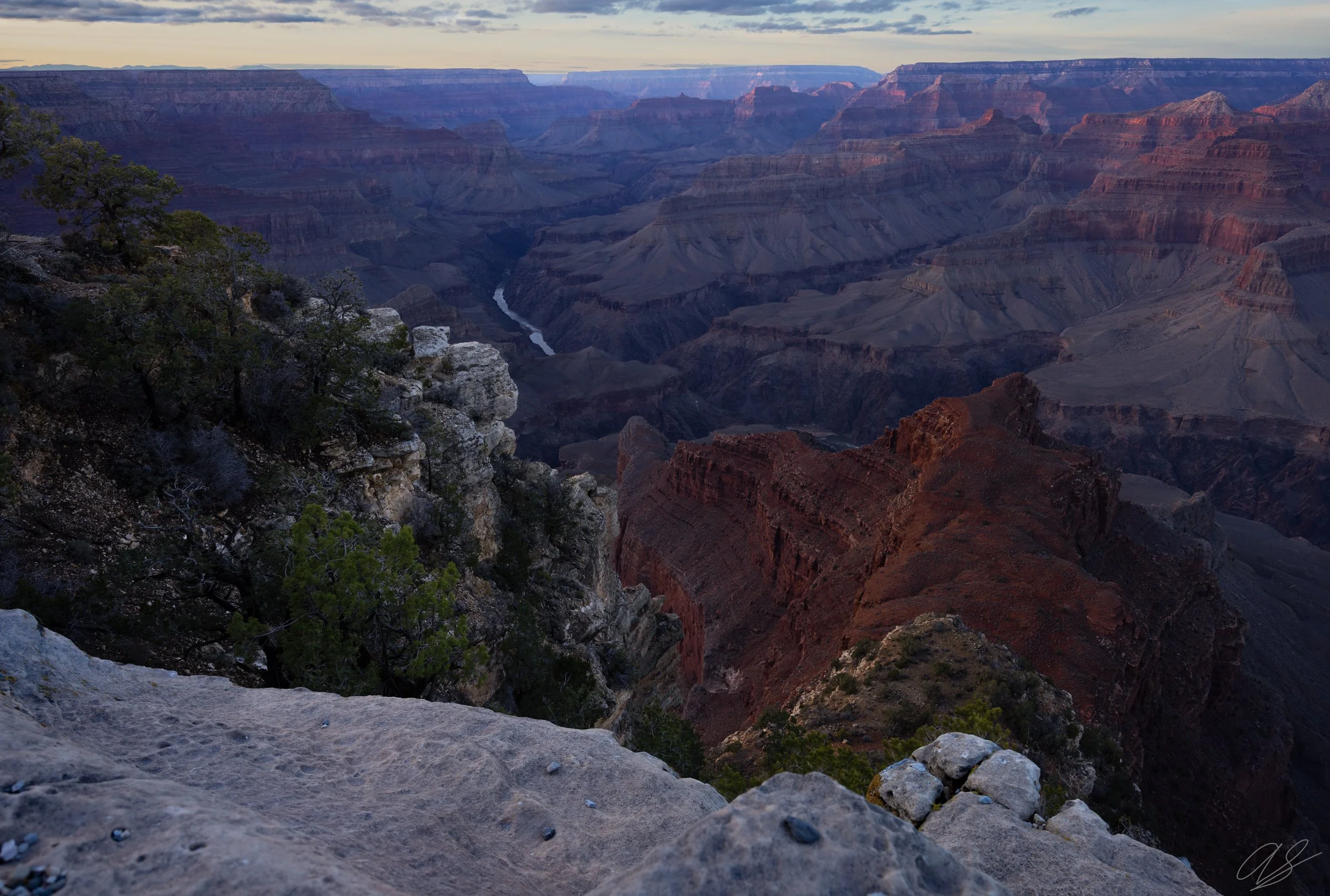 While visiting the Grand Canyon, I found several compelling compositions at Mohave Point on the South Rim for sunset. I took several compositions of this specific rock formation. I loved how the red spire in the middle of the frame flowed into the rest of the scene. I was drawn to the unique, notched rock in the foreground and the color gradient of the scene - white to red to purple.