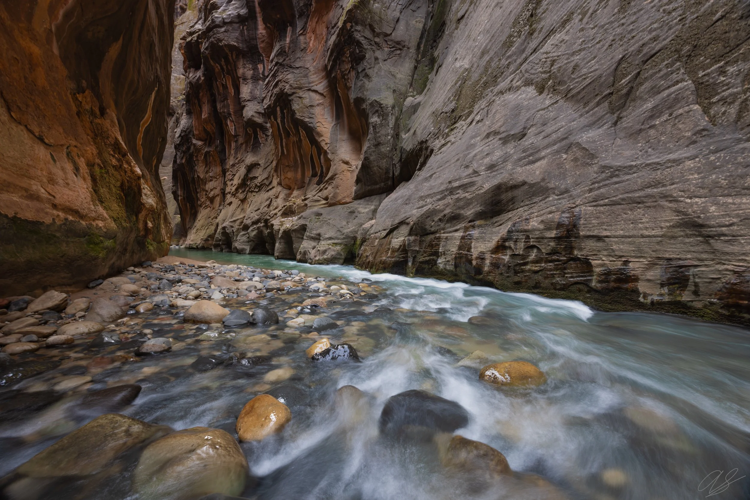 I found this composition right at the end of Wall Street - the most dramatic part of the Narrows. Going downstream, this was the first bend of the narrowest part of the Narrows. The river seems to curve outwards one last time before jutting sharply between two gigantic walls of rock - starting out wide and ending narrow.