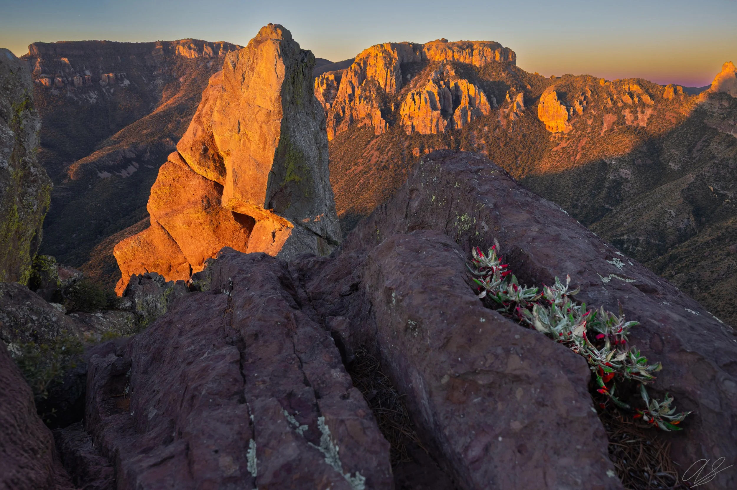 I took this image at one of my favorite places in the park - the ridge at the end of the Lost Mine Trail. From the top, there are so many beautiful vistas and compositions. This one was captured looking towards a prominent spire right off the edge of the ridge, backdropped by the Chisos Mountains. I loved this composition because of the shapes. The spire itself is beautiful and is almost perfectly dissected by the sun. The rock in the foreground is sharp, textured, and leads the viewer’s eye towards the tower - which is the main subject of the image. The small desert flower in the rock adds some beautiful colors to the scene that wouldn’t have existed without it.