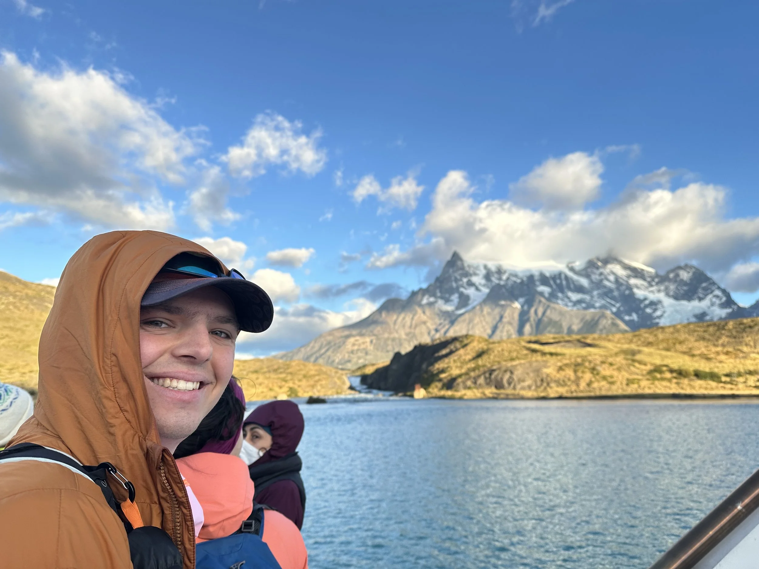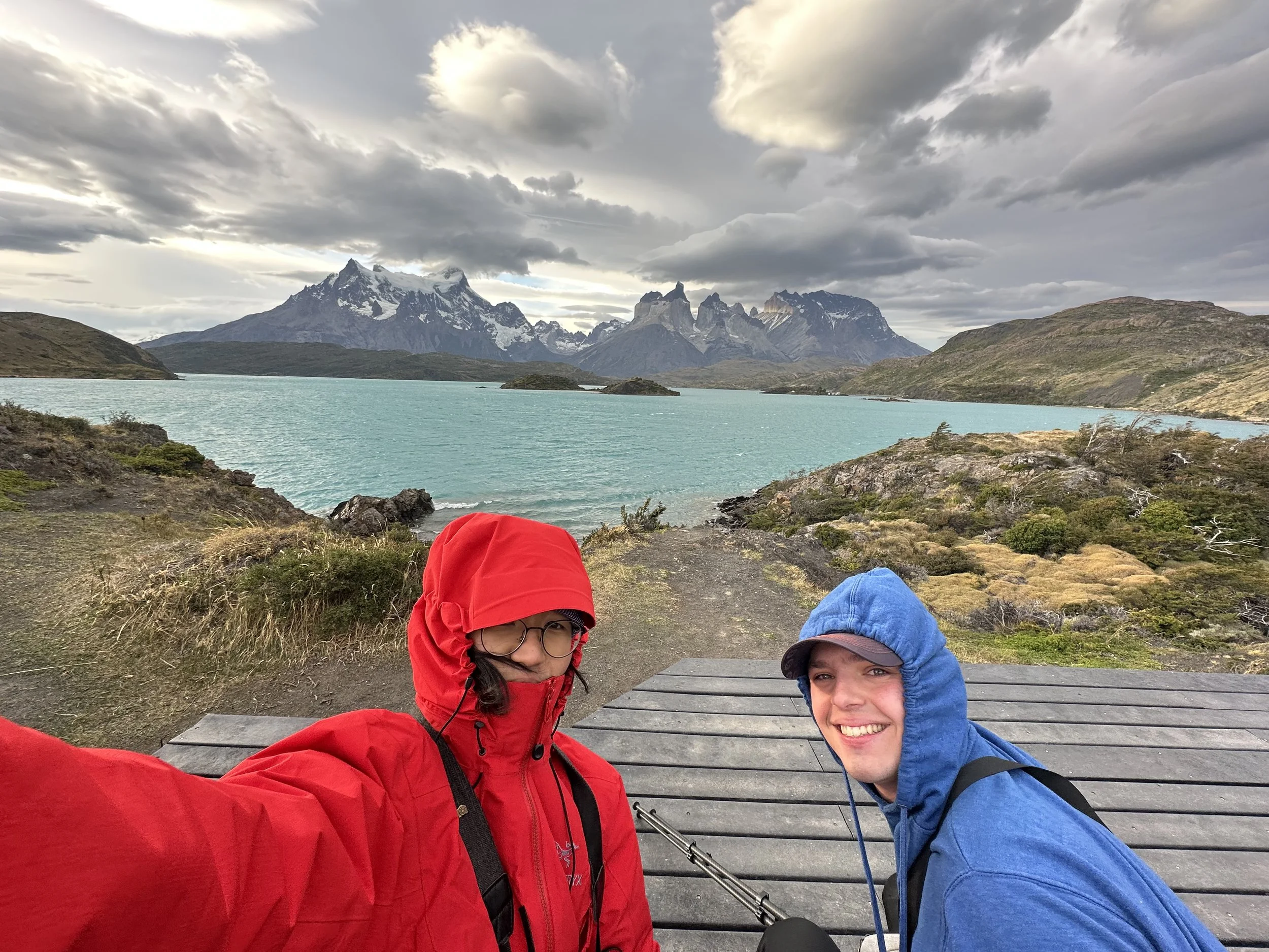 I travelled to Patagonia with my good friend, Sumin in March of 2025 - the beginning of fall in the Patagonia region. Our trip started in Punta Arenas where we rented a car with Europcar. We flew into Punta Arenas for several reasons: 1) More rental car options, 2) More flight options if our flight was to get delayed. From Punta Arenas, it was about a 3.5 hour drive to Puerto Natales - where we fueled up our rental car before heading into Torres del Paine. The road to Puerto Natales was excellent - fully paved with no major potholes. However, the ~95 km road from Puerto Natales to the south entrance of Torres del Paine (Rio Serrano) was terrible. It was paved for about the first 10 km - to Cueva Milodon - and then turned into a mix of paved and gravel road, before going almost entirely to gravel for the last ~40 km. In this section, we had to watch for potholes and drive much slower. Additionally, the Chilean tourist vans do not slow down or move out of the way - which made for an interesting driving experience on this narrow gravel road! However, this road is definitely driveable even in a sedan and was an absolutely stunning way to enter the park - as the mountains grow bigger and bigger as you keep driving. Our total driving time to Pehoe Lake from the Punta Arenas airport was almost 5 hours. We spent our first night at Camping Pehoe - on the shores of beautiful Pehoe Lake right in the heart of Torres del Paine National Park. Camping Pehoe was fantastic. Each campsite has a wind shelter, which is very helpful, and a flat area for our tent. Additionally, there are flush toilets and showers that are clean and in good condition. We reserved a campsite in advance but found that there was plenty of availability and we could have just walked in both nights we were there. Finally, there is a very nice main building, with a little camp store - which carries ramen/other camping food, fuel, and hiking snacks like protein bars. The building also had a nice restaurant. The food was good (nothing special) but the views were the truly spectacular part!