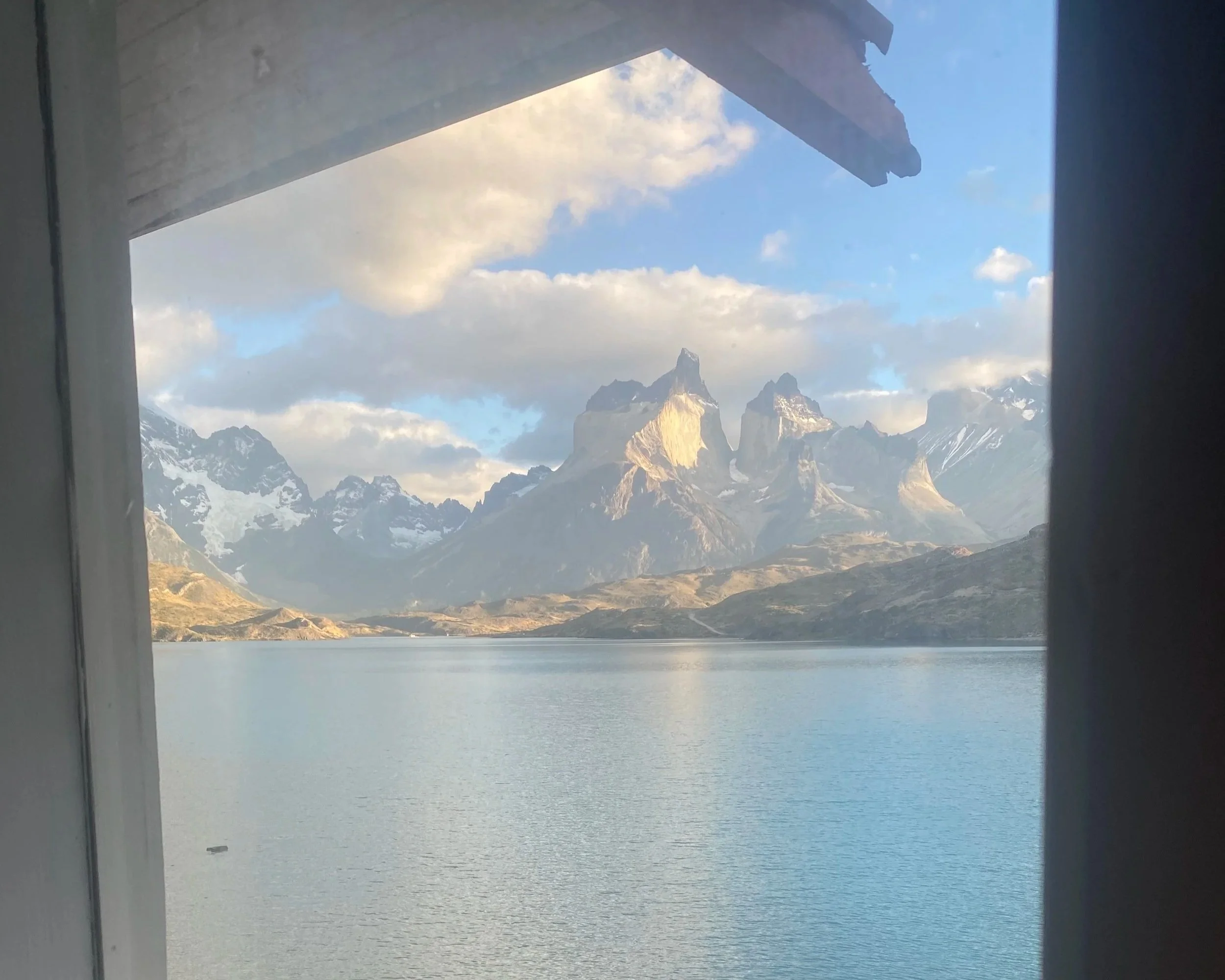 We arrived back to Paine Grande at 5:00 and barely missed the 2nd to last boat back to Pudeto. The last boat left at 6:40 but was completely booked online. Since we had paid in cash for our journey to Paine Grande, I was a bit concerned that we would not be able to make it back to Pudeto. However, even though the boat was entirely full, they still let every person that did not have a ticket (AKA paid in cash to get there) on the boat to return. As we were getting on the boat, I overheard one of the local guides talking to the boat operator about how they ALWAYS let everyone that paid in cash return back to Pudeto. I can’t guarantee that this will always be true, but it was encouraging to hear! That night, we stayed at Hosteria Pehoe - which is located on a small island in Pehoe Lake. This was my favorite night of our trip. I had seen reviews online that complained about paying ~$250 USD for a glorified Motel 6. I did not feel like this was the case. The room wasn't anything special - but it was perfectly clean and had a warm shower (+ shampoo/conditioner/soap). The special part about this accommodation was the main building. It is a small chalet-type building with a dining room, an upstairs reading room, and fast, free WiFi. When we walked into the main building after checking in, we found that there was a table reserved for each room for dinner. Dinner was ~$45 USD for 3 courses + a drink. The food was excellent all the way around! It was my favorite meal of the trip and when combined with the insane mountain views - it was an awesome experience! In the morning, there was a free breakfast and the same beautiful views!