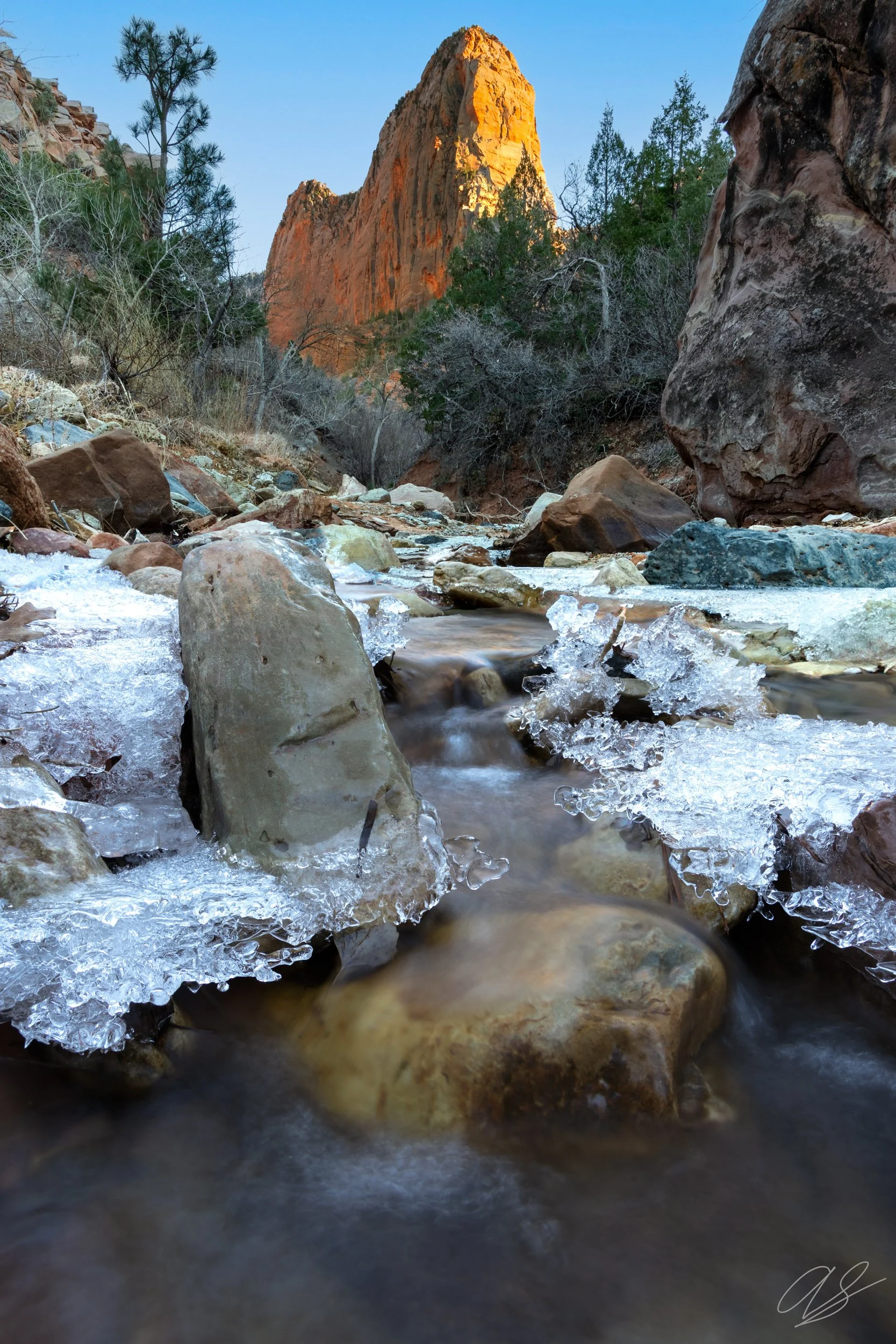 Kolob Canyons, the less-visited, more-remote side of Zion National Park is full of dramatic orange spires and narrow canyons. This image was captured on one of the trails in this region of the national park. The mountain in the scene is Paria Point, one of the prominent and impressive peaks in Kolob Canyons. I used a very slow shutter speed to capture the motion blur on the water - which smooths out the composition and connects the foreground to the background. Additionally, the ice formations on top of the creek on the sides of each channel was amazing. I love the colors in this image - which range from the cool white tones of the ice to the fiery orange hues of Paria Point in the background.