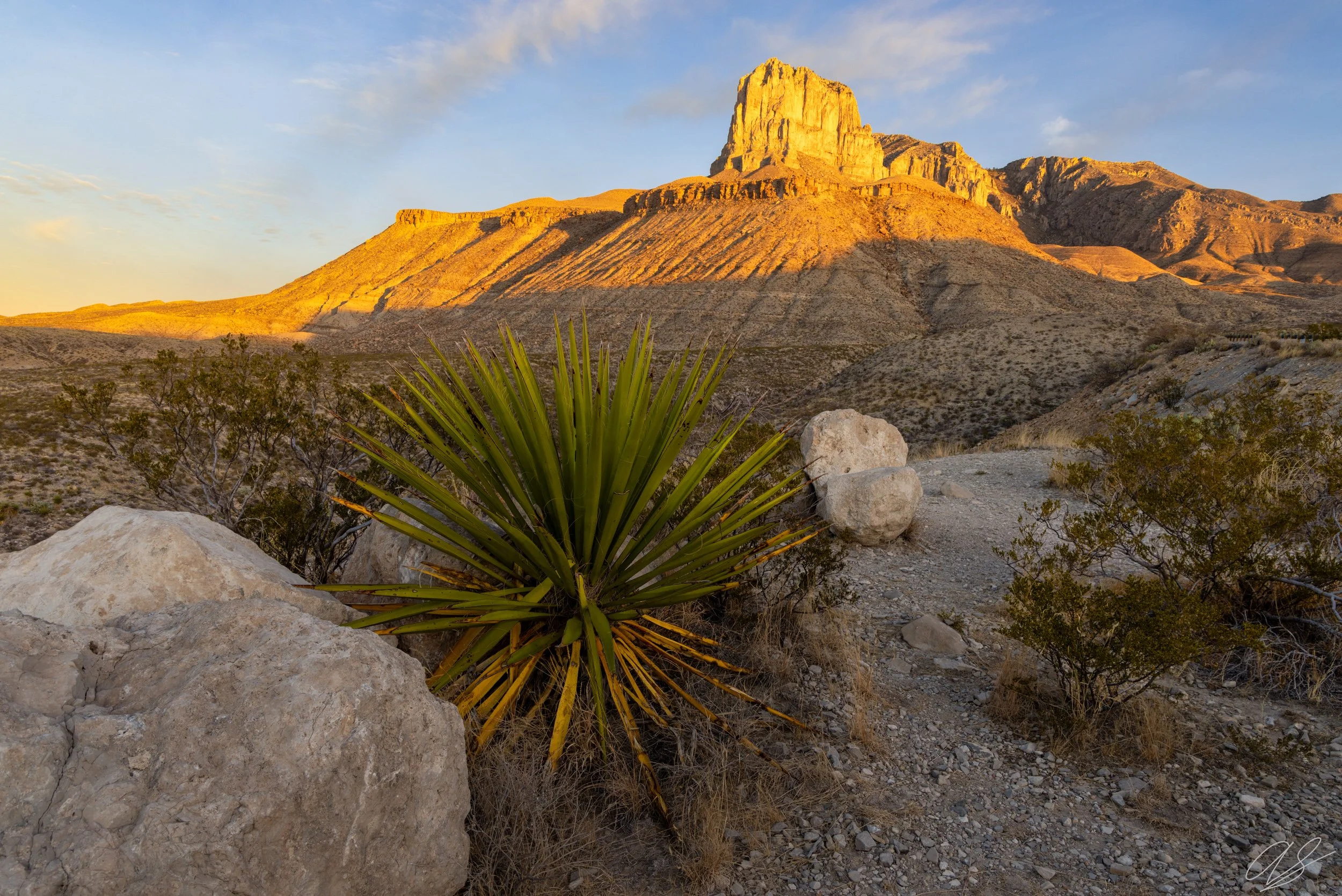 One of my favorite part of this image is the bright green yucca in the foreground. In the stark West Texas desert, finding this shade of green is rare. It contrasts well with the white stones in the foreground and the golden sunrise on the mountain.