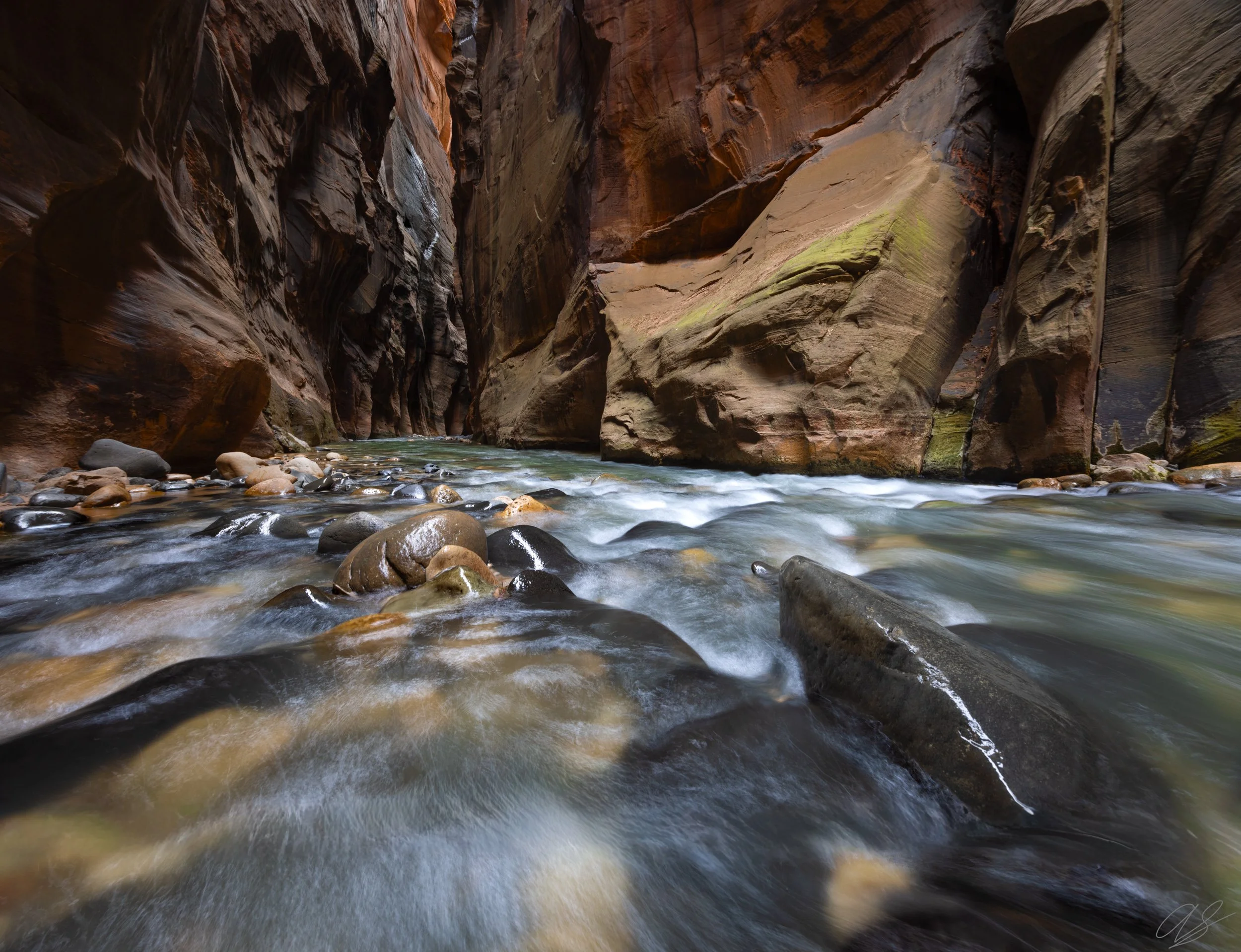 This photo was taken in “Wall Street” which is located deep in the heart of the Narrows of Zion National Park. Wall Steet is a 0.5-1 mile stretch of river 30 feet wide, surrounded by 1,500-2,000 foot tall cliffs. The river takes up the entire canyon, which makes for some fun but dangerous photography. I found this composition while hiking downstream - the shape of the rock on the right stood out to me. I was also able to capture some of the “canyon glow” the Narrows are famous for. While I brought a tripod with me, I quickly found that it was extremely difficult, if not impossible, to manage while battling the uneven rocks and the rushing water of the river. So I ended up shooting most of my Narrows photos HANDHELD. This photo was shot on a shutter speed of 0.6 seconds - which blurred the motion of the water nicely. The slowed shutter speed added an awesome flowing effect to this image.