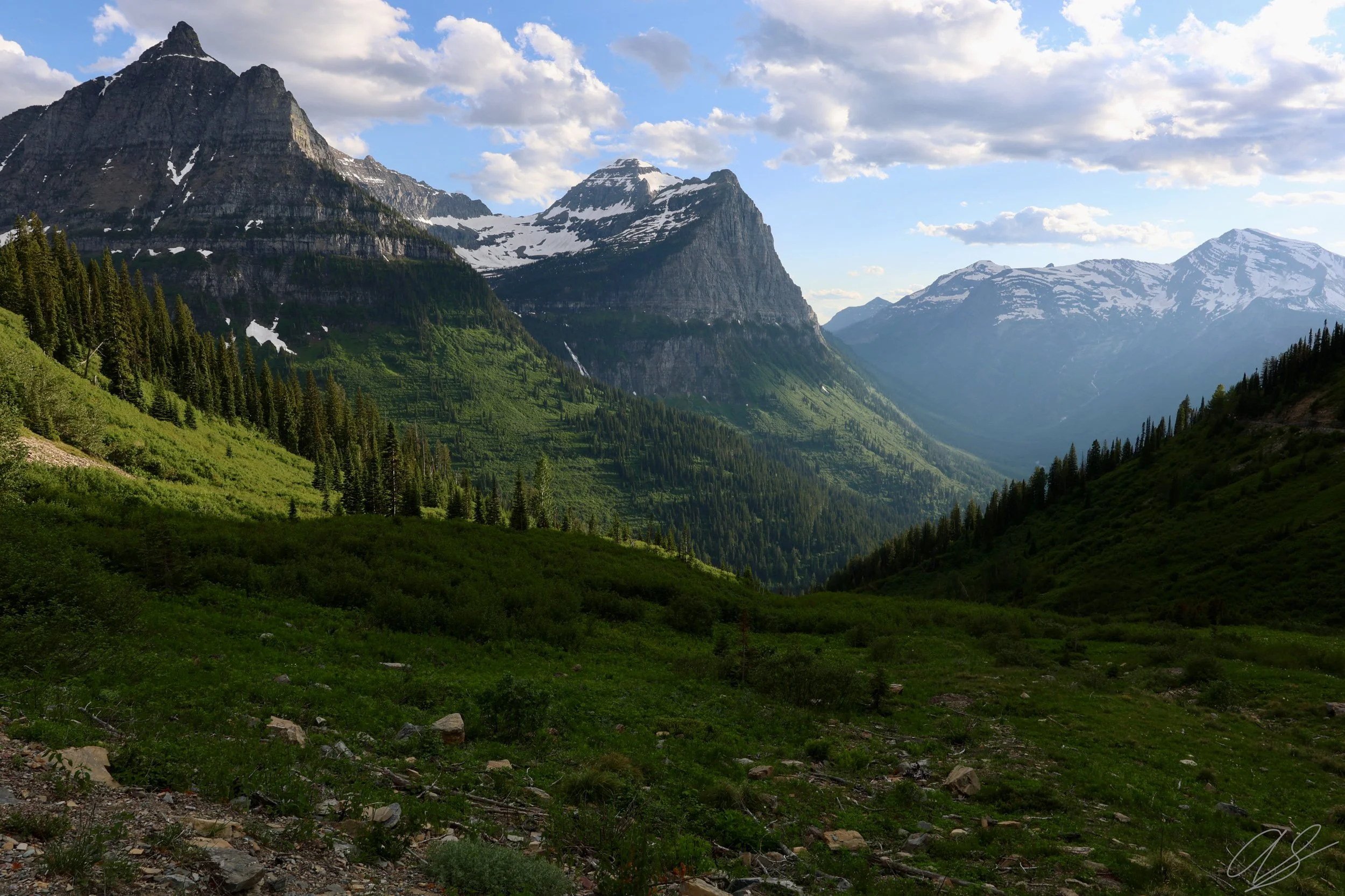 This image was taken along Going-to-the-Sun Road, a hair-raising, beautiful road that bisects Glacier National Park in Montana. This picture was taken near the highest elevation on the road, Logan Pass. The evening light on the peaks was beautiful to capture.