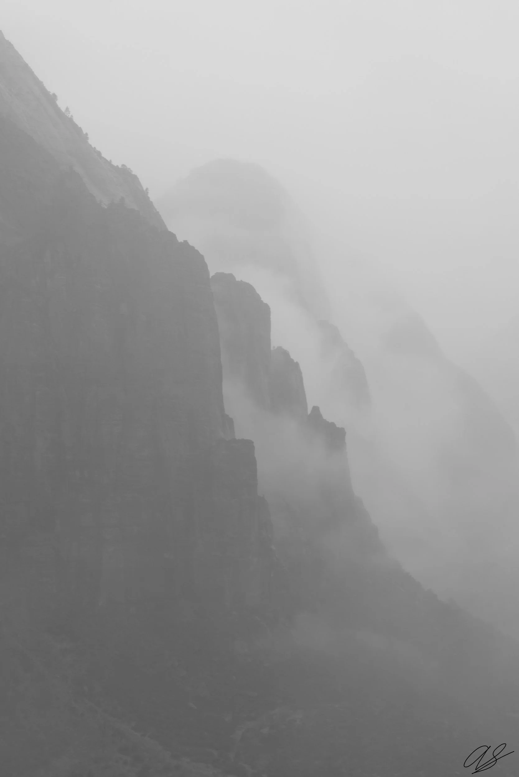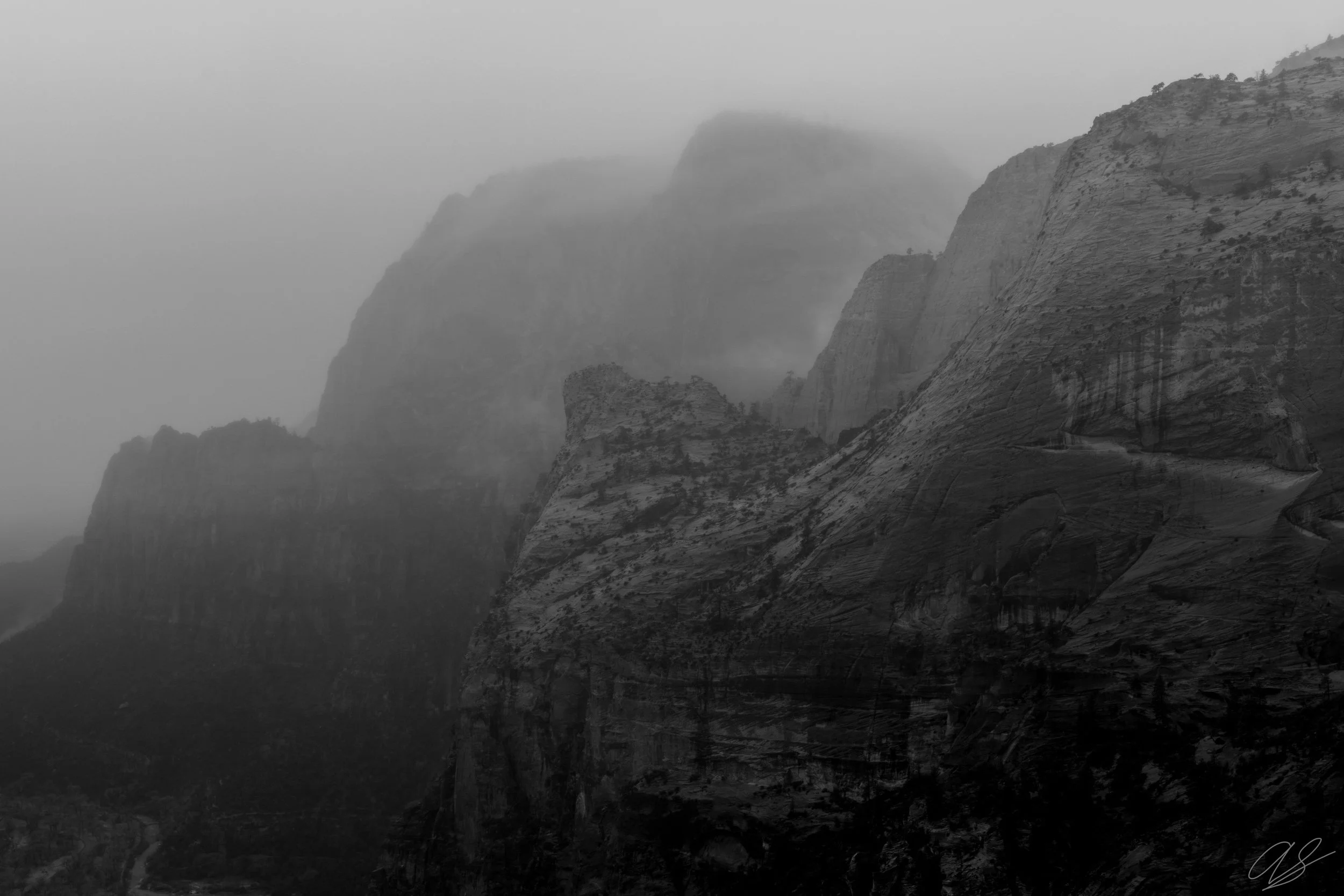 Taken on the way down from Angel’s Landing, these images capture the clouds of a moody day seeping between the peaks surrounding Zion Canyon. The thick clouds showed off the size and scale of the mountains of Zion.