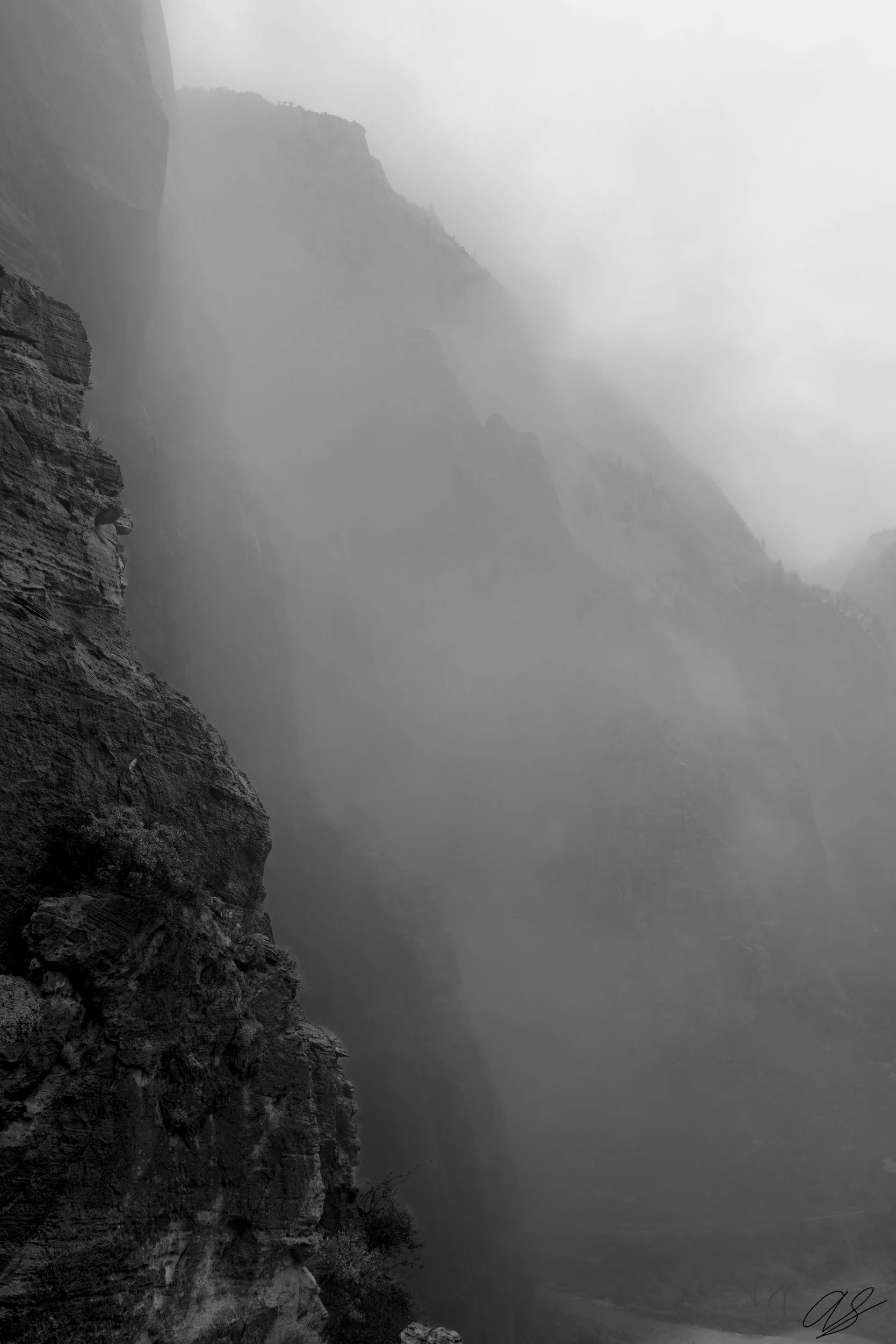 I took this image while hiking down from Angel’s Landing on the beautiful West Rim trail. As I rounded the corner, the trail opened up and revealed the mountains of Zion shrouded in ever-changing fog and clouds.