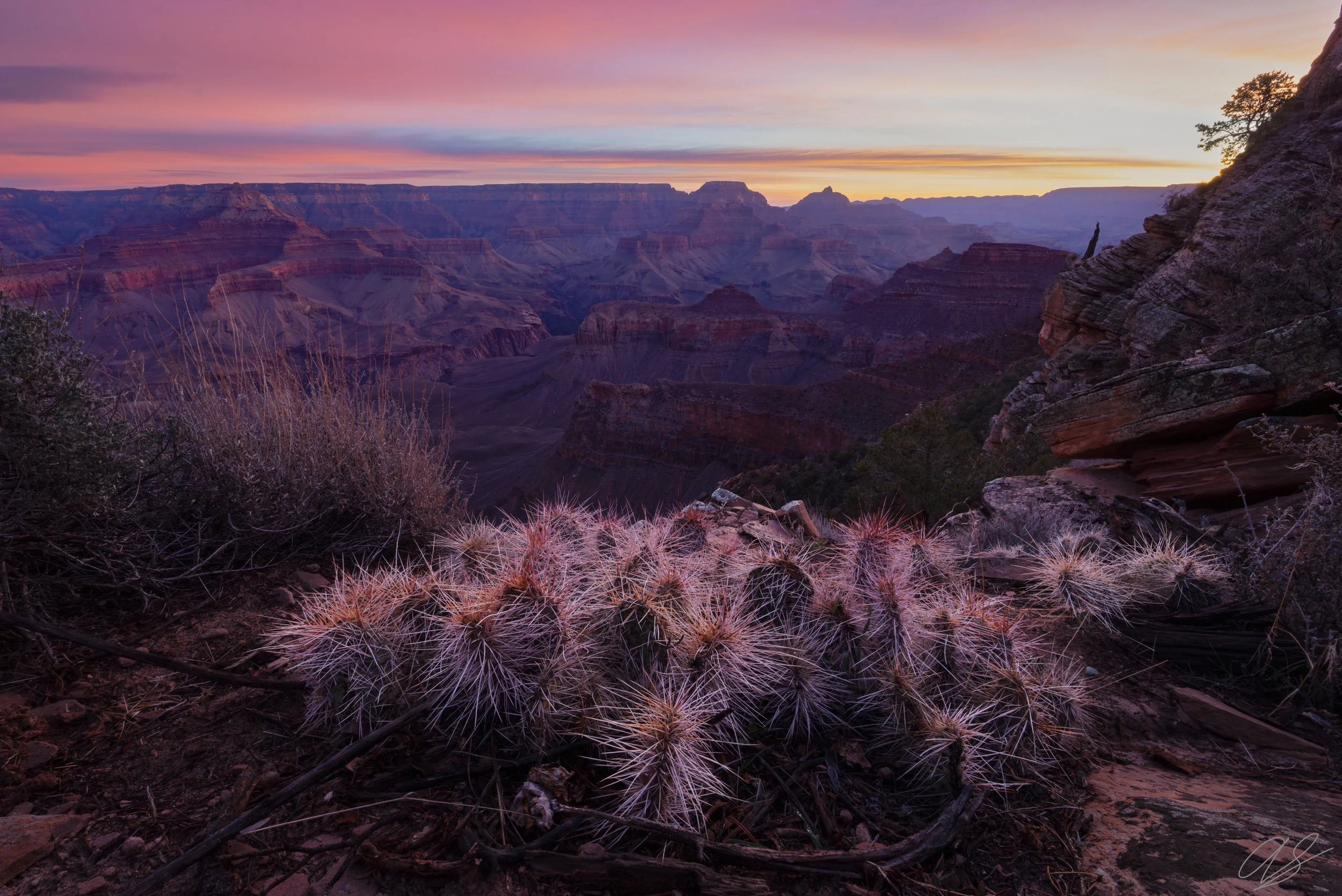 Taken near Ooh Aah Point on the South Kaibab Trail about 1,000 feet below the south rim, this area lives up to its name! I had been down to this area before and knew I wanted to come back for sunrise with my camera and tripod. This image was taken looking east towards Desert View and the end of the canyon. If you look (very) closely, you can actually see Desert View Watchtower about 25 miles away. The clouds on this morning were incredible. We started our hike around 6:30 for a 7:45 AM sunrise and the thin layer of clouds had turned bright pink and orange long before the rest of the canyon lit up. I was able to combine the beautiful sunrise with this awesome cactus I found on the edge of a cliff inside the canyon.