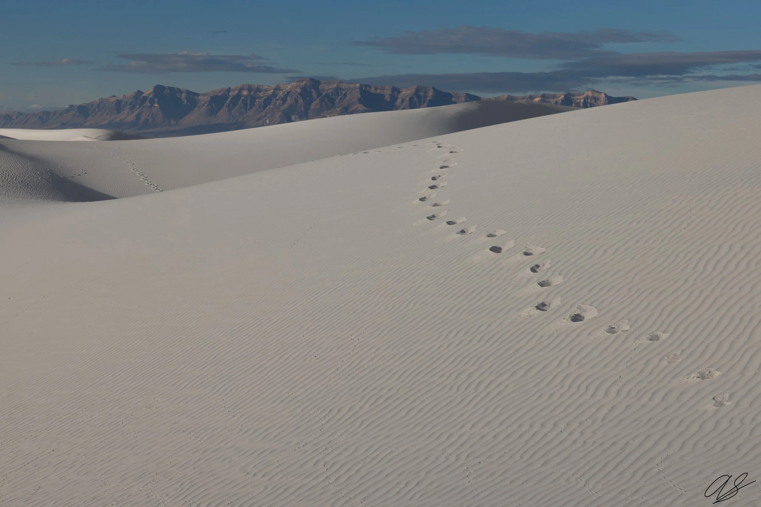 As I wandered through the gypsum dunes, I found tracks from a previous visitor isolated on an otherwise unspoiled dune. The tracks heading straight for the San Andres Mountains beyond the dunefield was an awesome composition to capture.