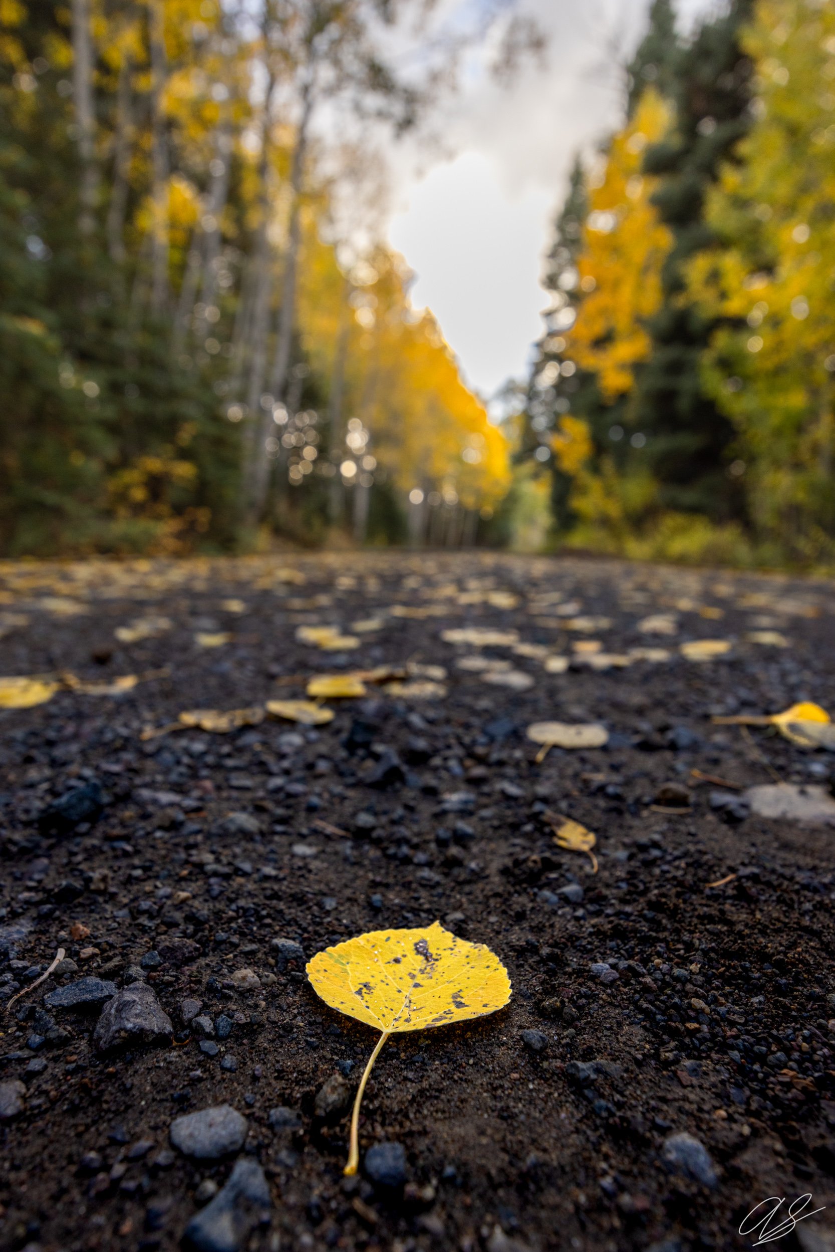 This vibrant aspen leaf pointing down the road was an awesome scene to shoot. The trees in the background are aspens at their peak fall colors. The gravel road I travelled on to get to this spot was covered in freshly fallen aspen leaves, which made for an amazing shooting environment. Shot near Pagosa Springs, Colorado.