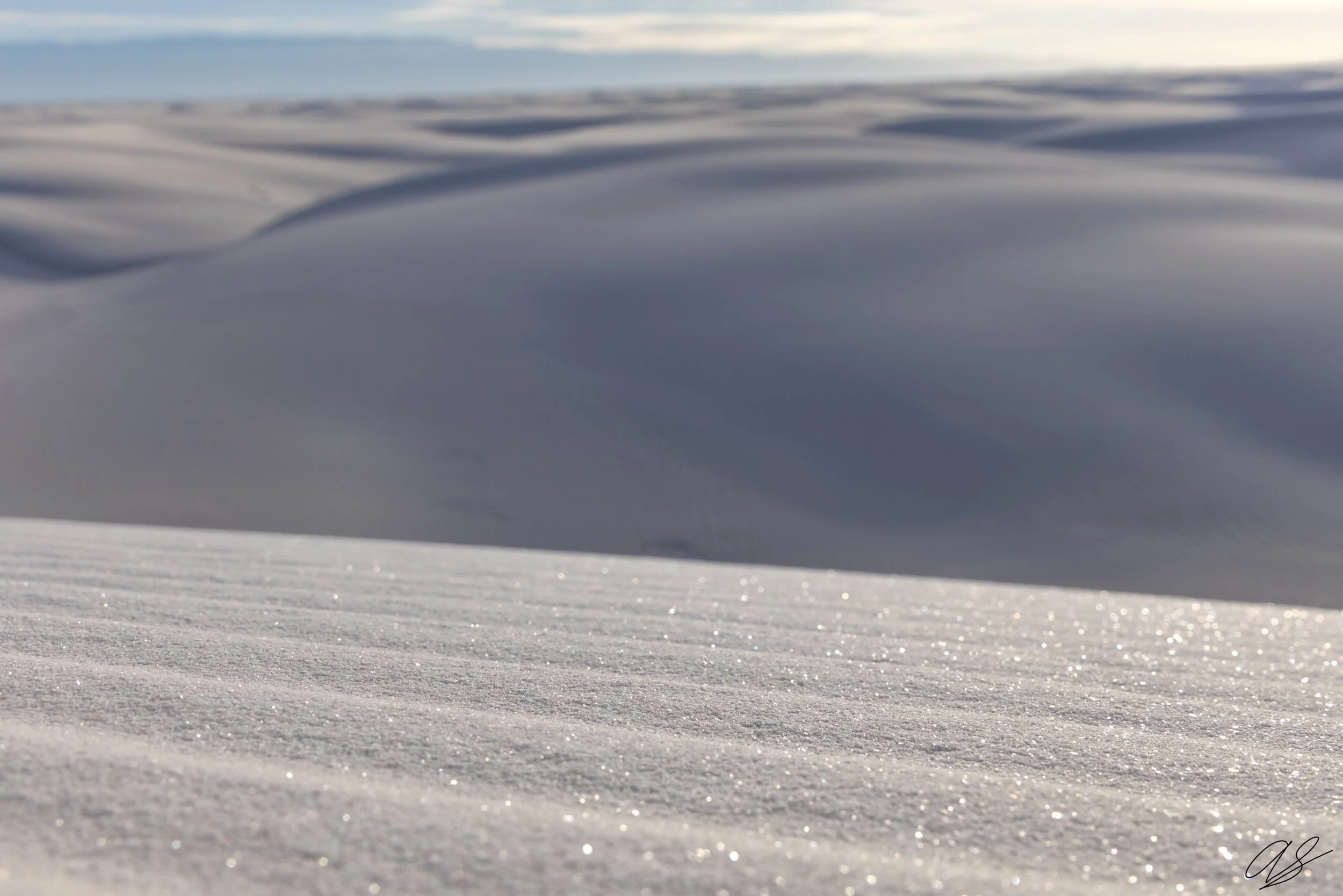 Deep in the gypsum dunefield of White Sands, this scene caught my eye. The undulating, never-ending dunes and the foreground where the sun was lighting up the sand, making it look like it was shimmering and sparkling, made for a great photograph.