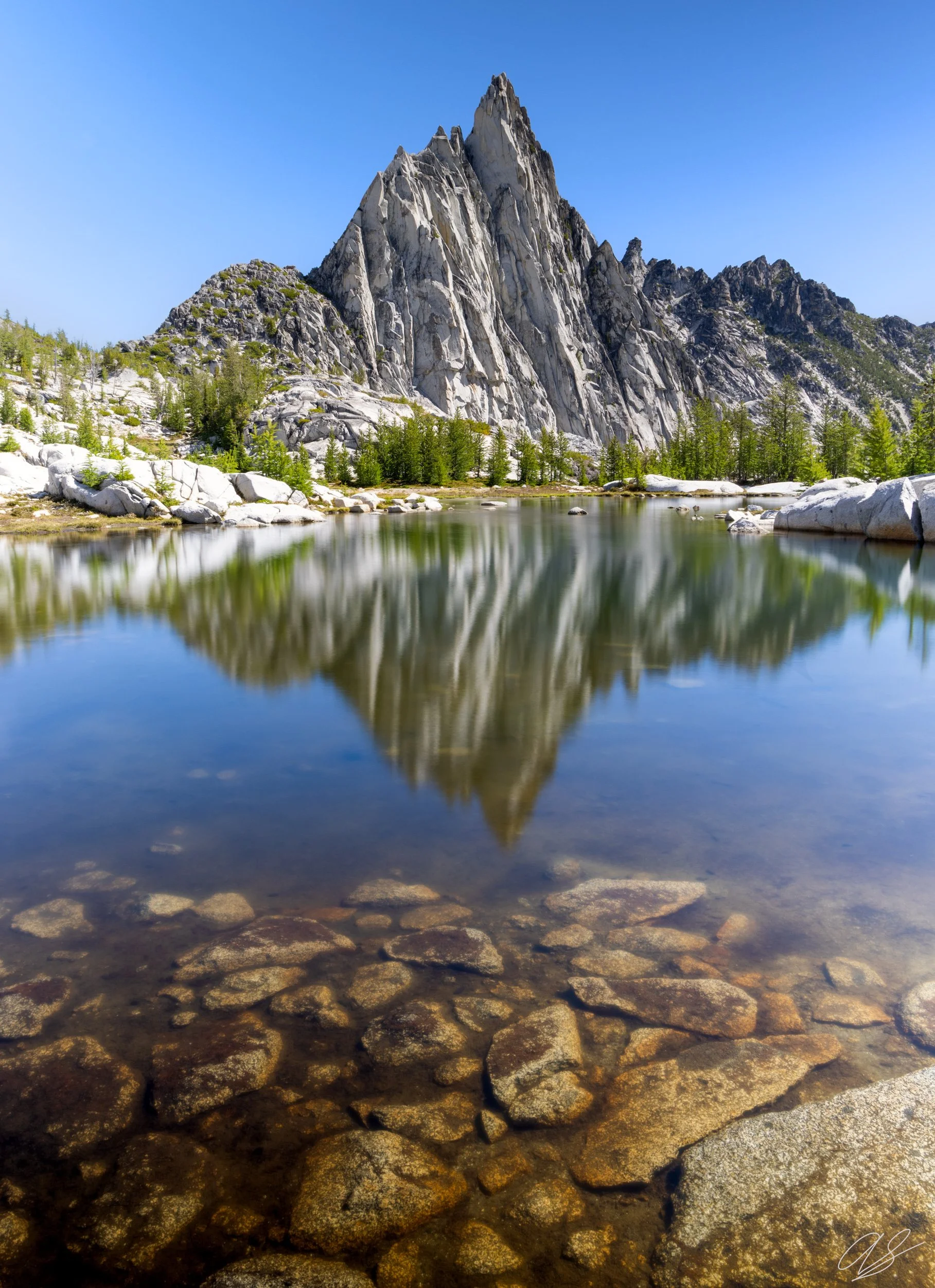 This image was taken during a one day thru-hike of the beautiful Enchantments area near Leavenworth, Washington. While the terrain is beautiful, the hike is tough! It is about a 22 mile hike with 6,000 feet of elevation gain. I took this shot at a famous pond which is a short detour off of the trail called Gnome Tarn. The tarn acted as a beautiful mirror for Prusik Peak in the background.