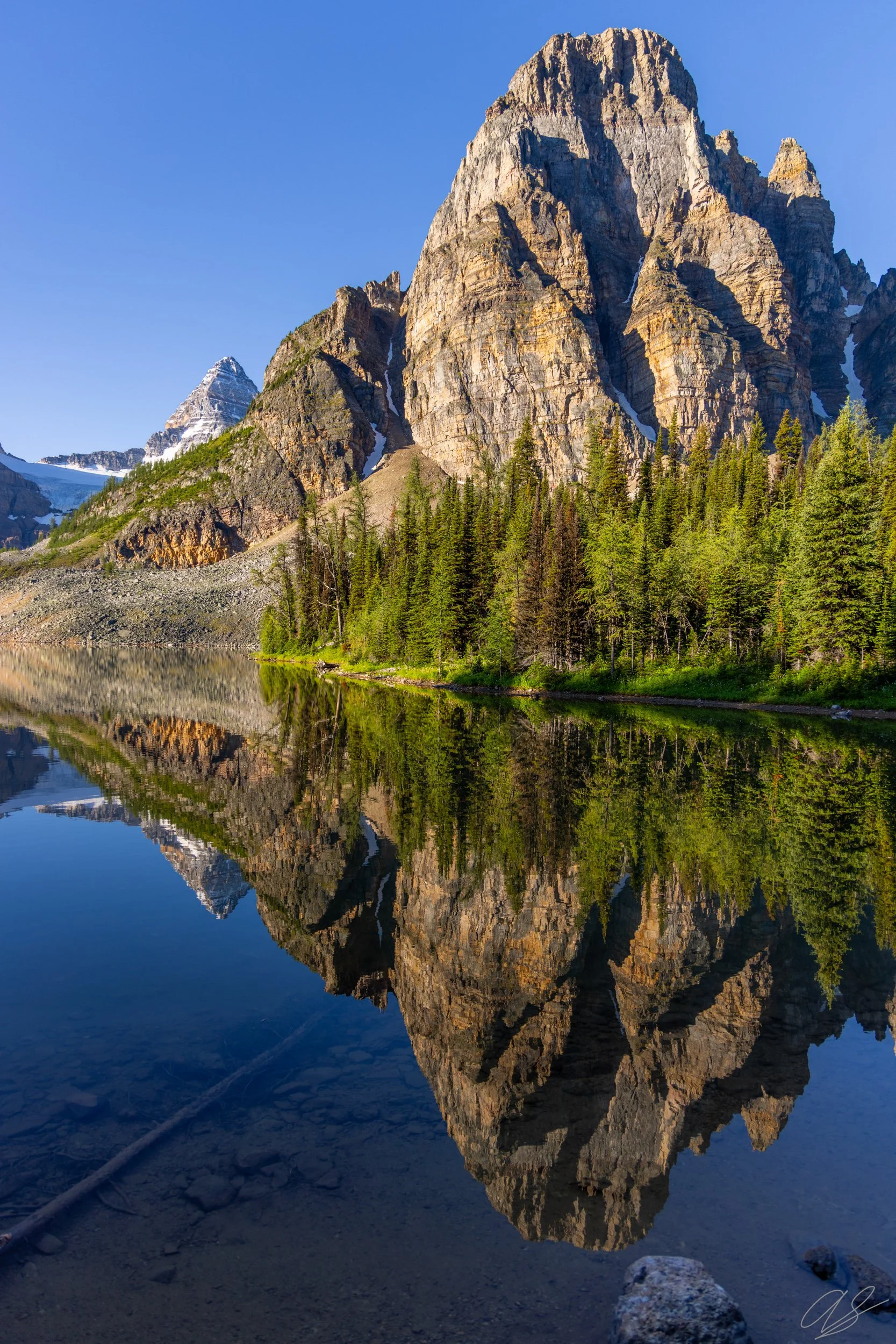 This image was taken from the shores of Sunburst Lake - which is a beautiful lake very close to the Magog Campground. The early morning light and still conditions allowed for an amazing reflection - with Sunburst Peak towering in the center and Mount Assiniboine off to the left.