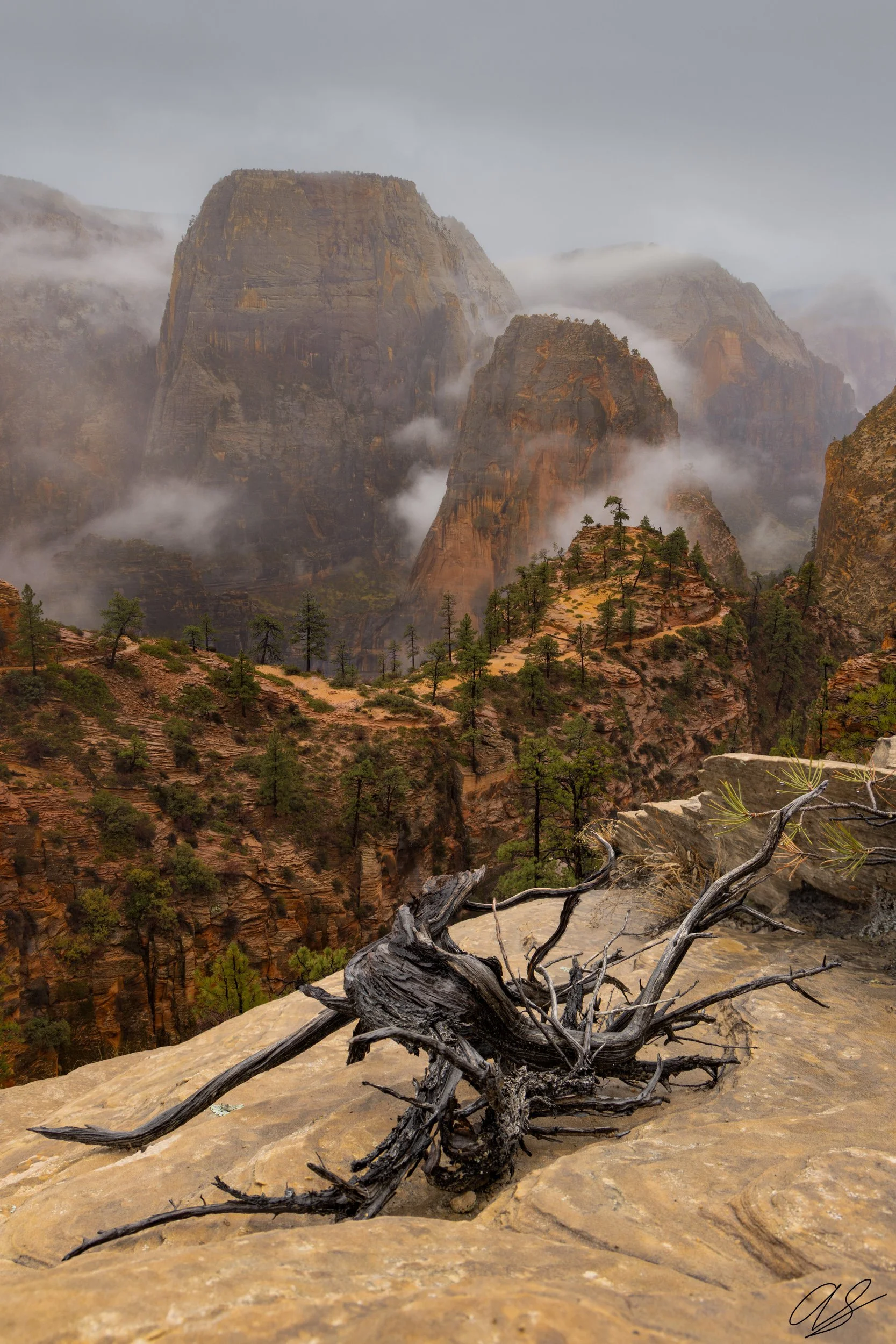 The area above Angel’s Landing is one of my favorite areas in the park and it’s obvious as to why. From this location, one can see Angel’s Landing jutting dramatically out into the valley, with the Great White Throne standing imposingly behind it. When I saw this twisted and gray branch in the front of this glorious scene, I was immediately drawn to it. This distorted branch has weathered countless storms and has been witness to the beauty of this scene night and day for years.