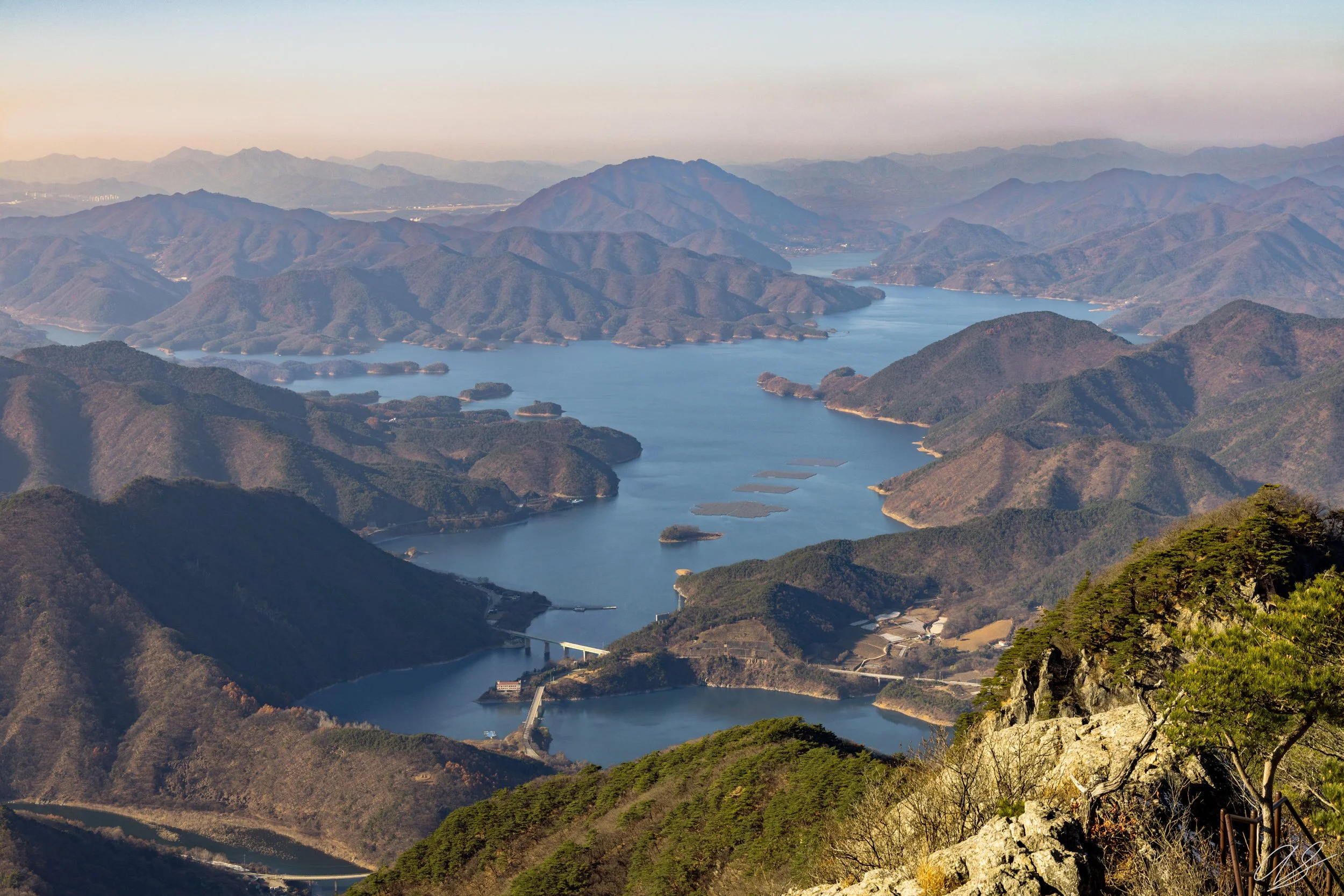 My favorite activity in nature is hiking - by a long shot. While I went to South Korea primarily to visit my good friend, I also wanted to see what Korean mountains looked like and conquer the country’s toughest trails. With that in mind, we set off (via bullet train) to the Korean countryside and began our summit of Woraksan. While the base-to-peak elevation of the mountain was “only” 2,700 feet, the toughest part of the hike was several false summits. We followed the trail and scrambled up and down these false summits for about an hour before reaching the peak. I took this picture on top of one of the false summits, looking down to the valley far below. The lake sprawling out below was an amazing sight to see from the top of Woraksan.